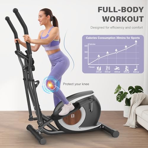 Kompaktes und platzsparendes Design: Der Ellipsentrainer kann mühelos bewegt werden. Kippen und rollen Sie ihn einfach zur Verwendung oder zur Lagerung weg, ohne schweres Heben oder Muskelanstrengung. Perfekt für Heim-Fitnessstudios, Wohnungen oder kleine Räume