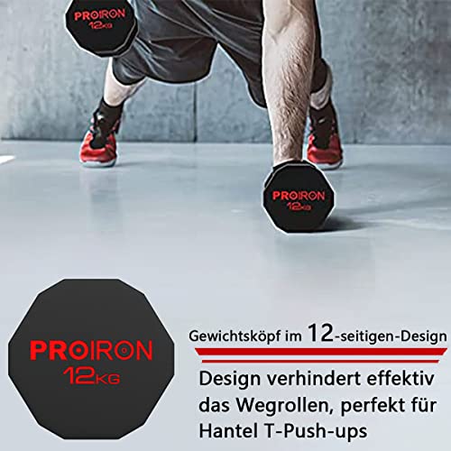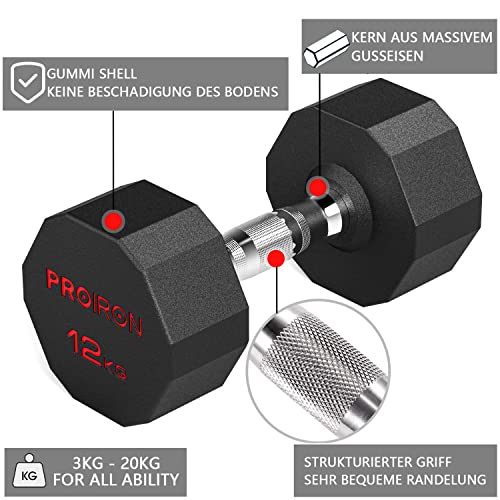 【12 kg 12-seitige Gummi Hanteln】: PROIRON engagiert sich seit vielen Jahren für die Hexagon Hanteln Forschung, die Verwendung eines einzigartigen wissenschaftlichen 12-seitigen Designs verhindert das Wegrollen des Gewichts und unterstützt Kernübungen wie Liegestütze und Planken. Flache gewichte hanteln lassen sich leicht auf dem Boden verstauen oder einfach übereinander stapeln.