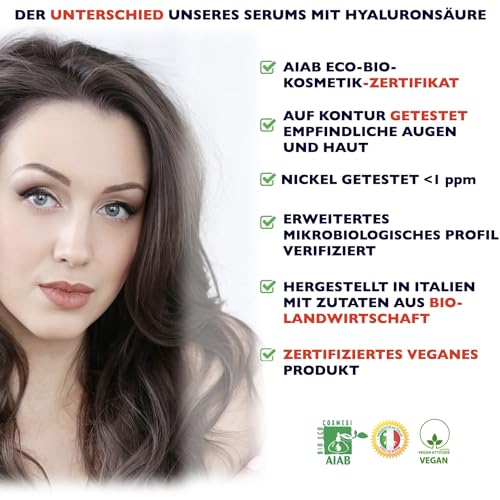 VEGAN & BIO: Alle unsere Produkte sind tierversuchsfrei, vegan und ohne schädliche Zusatzstoffe. Das Vitamin-C Hyaluron-Serum ist in Italien hergestellt und dermatologisch getestet. Der neutrale PH-Wert und die hohe Anzahl an Bio-Inhaltsstoffen, machen unser Beauty-Serum ideal für Männer und Frauen jedes Hauttyps. Innovative Produkt mit nieder-, mittel- und hochmolekularer Hyaluronsäure. VERPACKUNG KANN ABWEICHEN