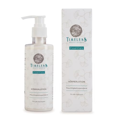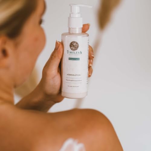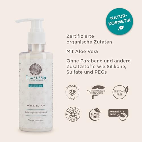 ESSENTIALS GESICHTS- UND KÖRPERLOTION – NATURKOSMETIK | Lotion für trockene, unreine Haut | Aloe Vera, Shea- und Mangobutter | 200ml | Erhöhung des Feuchtigkeitsgehalts +25% | TIMELESS BEAUTY SECRETS