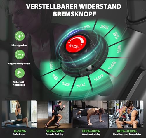 𝙈𝙞𝙠𝙧𝙤-𝘼𝙉𝙋𝘼𝙎𝙎𝙐𝙉𝙂 𝘿𝙀𝙍 𝙒𝙄𝘿𝙀𝙍𝙎𝙏𝘼𝙉𝘿, 𝙋𝙍𝘼̈𝙕𝙄𝙎𝙀 𝙎𝙏𝙀𝙐𝙀𝙍𝙐𝙉𝙂 : Das Spinning-Bike bietet eine 100-stufige mikro-verstellbare magnetische Widerstandseinstellung. Der intuitive Widerstandsknopf ermöglicht eine präzise Steuerung der Trainingsintensität und erfüllt die Bedürfnisse sowohl von Anfängern als auch fortgeschrittenen Nutzern. Der sanfte und stabile Widerstand ermöglicht es Ihnen, das Radfahren von flachem Terrain bis hin zu Hügeln zu erleben, wodurch die kardiovaskuläre Funktion und Muskelkraft gestärkt werden. Die Notbremse stoppt das Schwungrad sofort und sorgt für sichere Leistung.