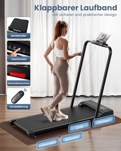 2 in 1 Laufband für Zuhause, Walking Pad Klappbar, 2,5 PS Laufband mit Armlehnen, Elektrisches Laufband mit LED-Anzeige und Fernbedienung, Geräuscharme für Zuhause/Büro (Schwarzes)