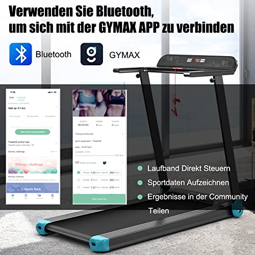 Bluetooth-Verbindung: Sie können das elektrische Laufband über Bluetooth mit „EsangAudio“ verbinden. Die Musik wird dann über die hochwertigen Bluetooth-Lautsprecher abgespielt. Außerdem kann das Laufband über die GYMAX App gesteuert werden, es erfasst Ihre Fitnessdaten, teilt sie mit der Community, ordnet sie in eine Liste, etc.