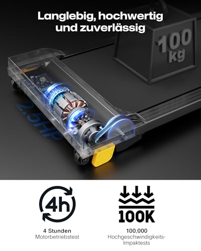 Hochwertige Verarbeitung: Extrem langlebig: Der walking pad wurde intensiv getestet (100.000 Laufzyklen & Belastungstests). Mit 2,5 PS Spitzenleistung und 550W Dauerleistung garantiert dieses Schreibtisch-Laufband dauerhafte Performance.