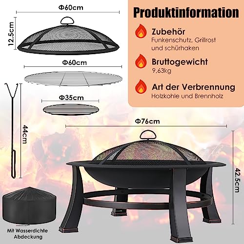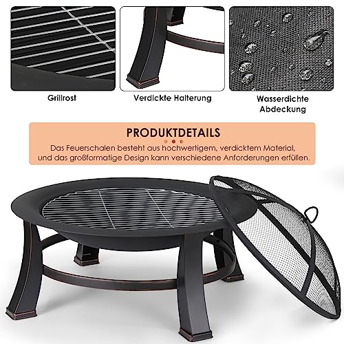 Feuerkorb mit funkenschutz, Φ76cm Feuerschale mit grillrost, Retro-Look Feuerstelle, Feuerschalen für den Garten, BBQ Feuerschale Grill, Stabil und Funktional, Schwarz, Groß