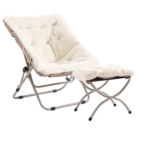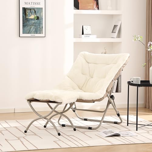 Bequemer Untertassenstuhl mit Ottomane, übergroßer Faltbarer Loungesessel aus Kunstfell, Lesesessel mit Metallrahmen, Moon Lazy Chair, Akzentstuhl für Schlafzimmer, Wohnzimmer, Schlafsäle