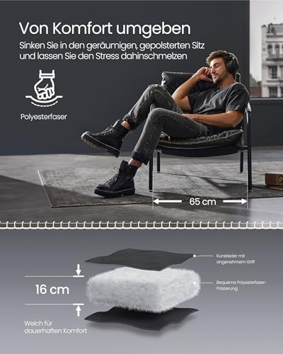 VASAGLE EKHO Kollektion – Loungesessel, Armlehnenstuhl mit Metallrahmen, Kunstleder, mit Nähten, Mid-Century-Modern-Stil, für Wohnzimmer, Schlafzimmer, Arbeitszimmer, Lounge, tintenschwarz LAC014B01