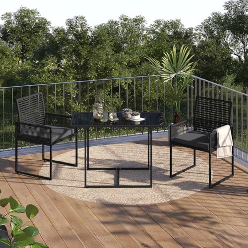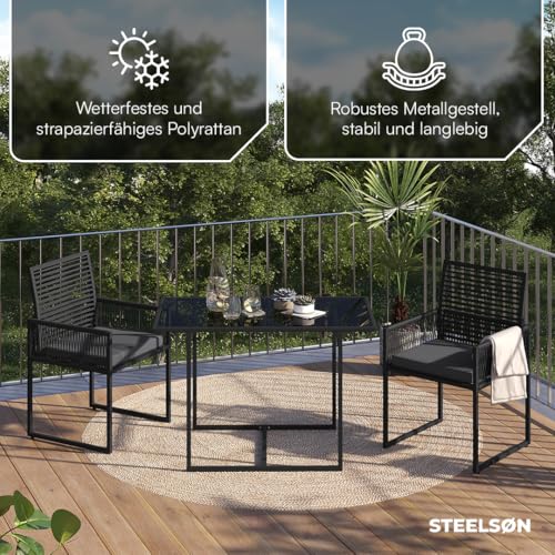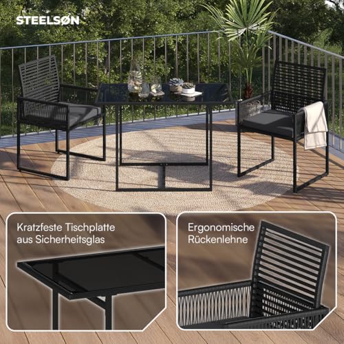 3-TLG Garten-Essgruppe Kynaris, Esstisch mit 2 Stühlen, gartenmöbel Sitzgruppe Polyrattan mit Kissen, Gartenlounge, Balkomöbel Set, schwarz