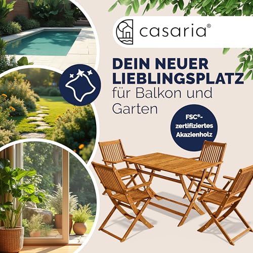HOCHWERTIGE GARTENMÖBEL: Die 5-teilige Sitzgruppe von CASARIA aus FSC -zertifiziertem, witterungsbeständigem Akazienholz gefertigt, eignet sich hervorragend für deinen Garten oder den Wintergarten. Durch das elegante Design wird die Garnitur zum Hingucker in deinem Zuhause.