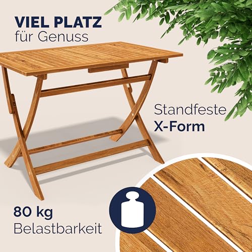 NATÜRLICHES MATERIAL: Die massive Sitzgarnitur besteht aus Akazien Hartholz. Dieses hochwertige Naturprodukt zeichnet sich durch seine Langlebigkeit und Wetterfestigkeit aus. Deine neue Essgruppe eignet sich dadurch bestens für eine dauerhafte Nutzung im Außenbereich.