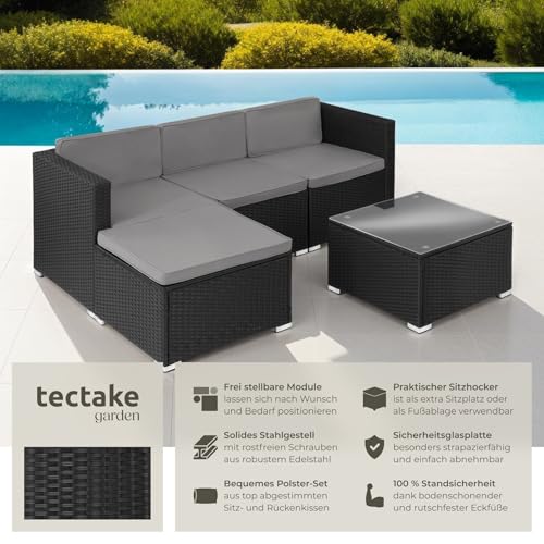 tectake® Poly Rattan Lounge, Outdoor Sitzgruppe, Set mit Sofa Sessel, Hocker, Tisch, frei kombinierbar, Sitzecke für 3-4 Personen, Möbel wetterfest für Garten Terrasse Balkon – schwarz