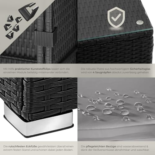 LOUNGE SET MIT KOMFORT & PFLEGELEICHTIGKEIT: Entspanne Dich auf abnehmbaren, wasserabweisenden und waschbaren Bezügen. Unsere Garten Lounge vereint Komfort mit einfacher Reinigung, sodass Du mehr Zeit zum Genießen hast. Der Gartentisch mit abnehmbarer Platte aus Sicherheitsglas ist nicht nur elegant, sondern auch leicht zu pflegen. Natürlich ist auch der Sofa Tisch, das Herzstück unseres Garten Loungemöbel Set, wetterfest.