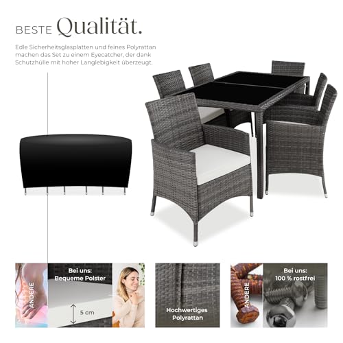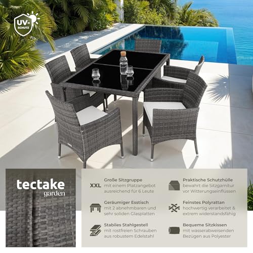 tectake Polyrattan Sitzgruppe für 6 Personen, Balkon Möbel, Gartenmöbel Set mit Tisch und 6 Stühlen, Essgruppe für Garten Terrasse und Balkon, inkl. Sitzkissen und Schutzhülle – grau/weiß