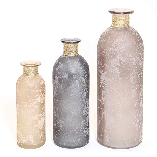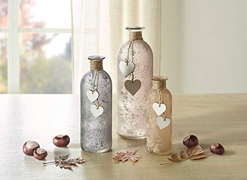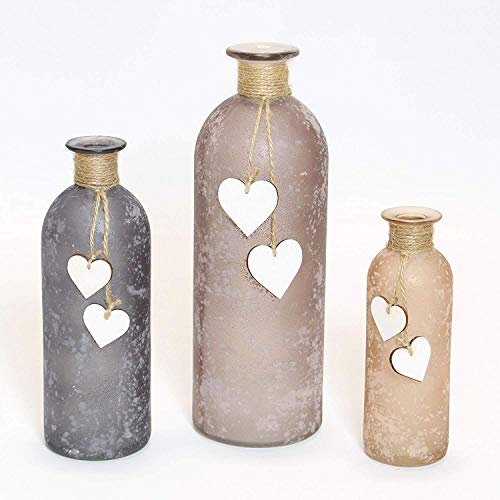 In sanften Grautönen und Erdtönen, satiniertes Glas mit weißen Gesprenkeln, verziert mit Sisalkordel und kleinen Holzherzen. Größe: (Durchmesser x Höhe) 5 x 16 cm, 7 x 20 cm, 9 x 26 cm, nicht spülmaschinengeeignet.