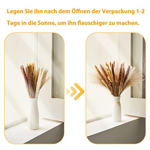 【WARMER HINWEIS】Nachdem Sie das Produkt erhalten haben, können Sie den Trockenblumenstrauß 2-3 Tage in der Sonne trocknen, um ihn flauschig zu machen. Es fällt beim Schütteln leicht ab, was eine natürliche Eigenschaft ist. Sie können auch einen Fön verwenden, um den Pampasgras beim Trocknen flauschiger zu machen, und Haarspray verwenden, um den Haarausfall zu reduzieren. Bei Fragen können Sie sich jederzeit an uns wenden.
