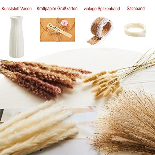 【Reichhaltiger Produktinhalt】Hinweis: Enthält Vasen. Das pampasgras set (39 Stück) ist ein exquisites kunstwerk, das aus 4 verschiedenen farben von getrocknete blumen besteht. Sie Erhalten Naturpampas (8 Stück) und Weiße Pampas (8 Stück), Schilfgras (8 Stück) und Kaninchenschwanzgras (15 Stück), mit Weißem Vintage Spitzenband, beige Satinband, Vintage Kraftpapier Grußkarten und Vasen. Die Vase misst 7.8*7.8*20.5cm. Die Vase ist im Lieferumfang enthalten, Sie müssen keine neue Vase kaufen.