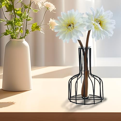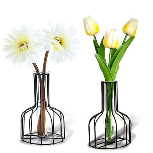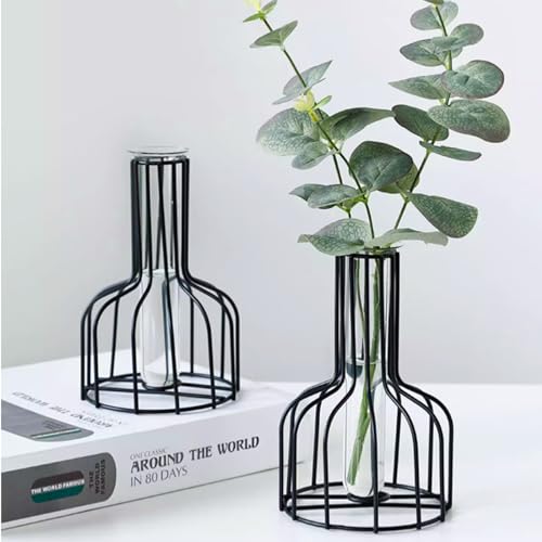 Schwarze Blumenvase mit Metallrahmen 2 Stück, Klares Glas, Reagenzglas, dekorativ, Kleine Knospenvasen, Geschenke für Hochzeitsdekoration Tischblumendekoration, Innendekoration Wohnzimmerdekoration