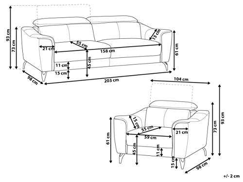 Modernes Wohnzimmer-Set mit verstellbarer Kopfstütze. Dieses elegante Set ist dank seiner vielfältigen Ausstattung die ideale Wahl für jedes Wohnzimmer. Das Sofa und der Sessel verfügen über Kopfstützen, die in 6 Positionen verstellbar sind. Die breiten, tiefen Sitze und qualitativen Lederpolster sind sehr pflegeleicht. Schlanke, geschwungene Beine ergänzen den schönen goldbraunen Farbton und bringen ihre brillante Form zur Geltung. Die Kombination all dieser Elemente sorgt für einen zeitlosen Look der Möbel.