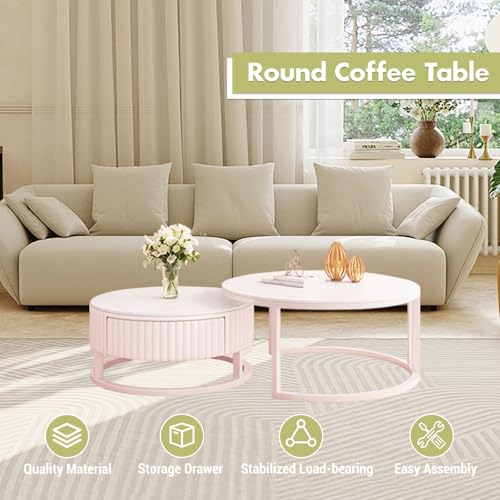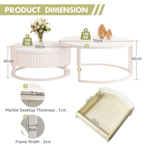 Couchtisch Rund Weiss 2er Set 50+70cm Runder Couchtisch Marmor Mit Stauraum Modern Wohnzimmertisch Weiß Mit Holz Schublade Tisch Wohnzimmer Ausziehbar Satztische Fürs Wohnzimmer