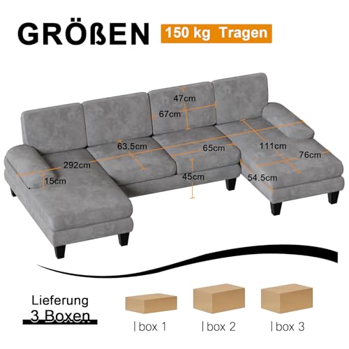 Einfache Montage: Sofa u form (BxTxH) 292 x 111 x 92 cm, Das Ecksofa ist einfach zu montieren, weil es leicht zu verbinden ist. Es kann in weniger als 30 Minuten ohne Werkzeug aufgebaut werden.Das Sofa wird in 3 Paketen verschickt und kommt in 2-3 Tagen an, Bei Fragen können Sie uns gerne kontaktieren, vielen Dank für Ihr Verständnis.