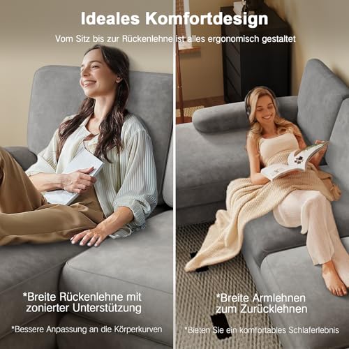 Couch mit Schlaffunktion kombiniert maximalen Komfort und Langlebigkeit: Big sofa verfügt über doppelt gepolsterte Schaumstoffkissen und übergroße bequeme Kissen, übergroße Kissen und hochwertige Wellenfedern für gleichmäßige Druckverteilung und optimalen Komfort. Die innovative Federung sorgt für die langfristige Stabilität des Sofas und bietet auch bei häufiger Nutzung dauerhaften Komfort. Zwei Sofa mit Liegefunktion bieten den Gästen zusätzlichen Komfort und erweitern die multifunktionale Nutzung dieses Möbels.
