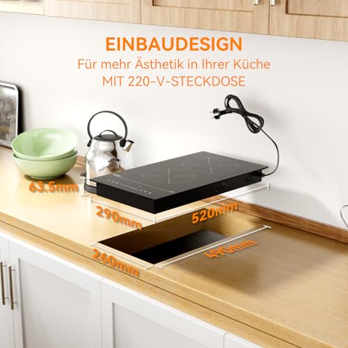 【Zwei Zonen Design】Induktionskochfeld mit den Abmessungen 520*290*63,5mm mit 220V-Stecker. Kann zwei Gerichte gleichzeitig zubereiten, um effizienter zu kochen.