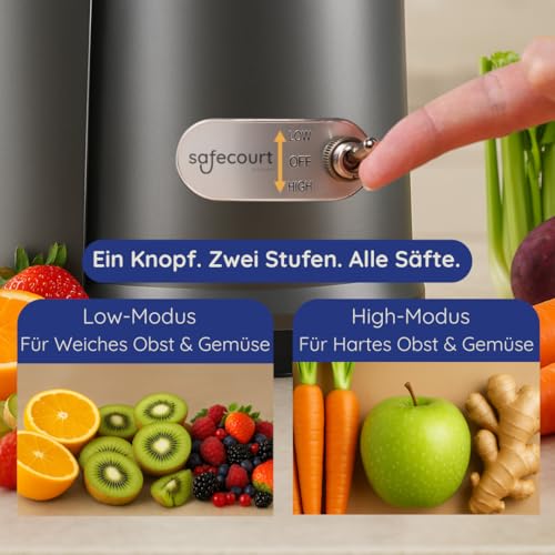𝗠𝗘𝗛𝗥 𝗩𝗜𝗧𝗔𝗠𝗜𝗡𝗘. 𝗪𝗘𝗡𝗜𝗚𝗘𝗥 𝗔𝗨𝗙𝗪𝗔𝗡𝗗: Täglicher Frischsaft war noch nie so einfach. Der Safecourt Entsafter holt das Maximum aus Obst und Gemüse – vollgepackt mit Vitaminen, frei von Zusatzstoffen und in wenigen Minuten trinkbereit. Ideal für alle, die ohne Mühe gesünder leben möchten – für einen natürlichen, frischen Start in den Tag mit deinem neuen Slow Juicer.