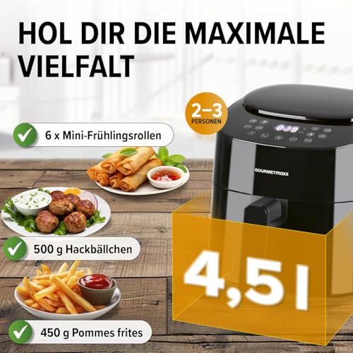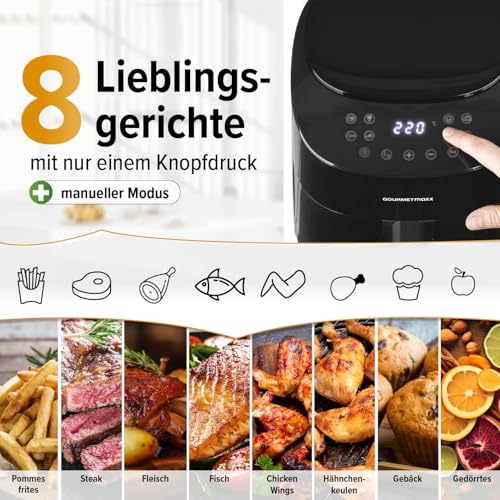 GOURMETmaxx Heißluftfritteuse | 4,5L Airfryer | Timer & Touchscreen | Fritteuse mit 9 Funktionen & 8 Programmen | energiesparend frittieren, nahezu ohne Öl | Minibackofen – 1400 W