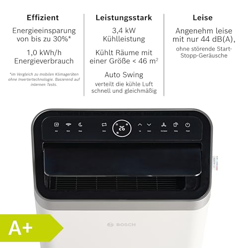Bosch Cool 5000 mit Invertertechnologie Mobiles Klimagerät – 3-in-1: Klimagerät, Luftentfeuchter, Ventilator – 3,4 kW für Räume bis zu 46 m² – Mit Auto-Modus, Silent-Modus & Sleep-Modus