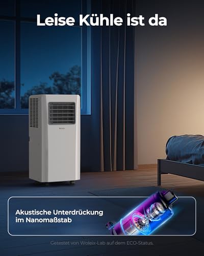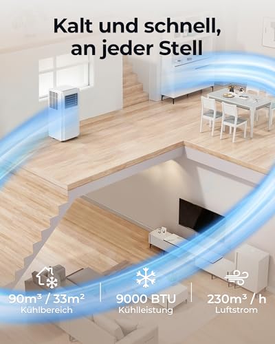 3-in-1-Vielseitige Funktionalität: Genießen Sie mit mobiles Klimagerät ganzjährigen Komfort mit Kühl-, Entfeuchtungs- und 3-stufigem Lüftermodus. Mit Klimaanlage mobil können Sie perfekt gegen Sommerhitze, zur Reduzierung der Luftfeuchtigkeit oder für frische Luft.