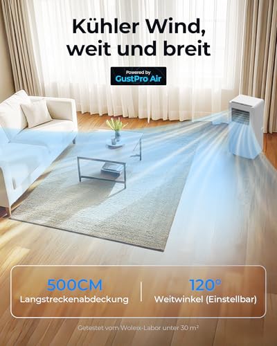 Große Reichweite, Schnelle Abkühlung: Der Ventilator dieser mobile Klimaanlage mit Abluftschlauch nutzt die Turboaufladungstechnologie, die Luftmenge um zusätzliche 30 % (230 m³/h) steigern und eine Reichweite von bis zu 5 Metern erreichen kann. In Verbindung mit dem ultraweiten 120°-Weitwinkelluftstrom von Klimaanlage mobil kann eine schnelle und umfassende Kühlung erreicht werden.