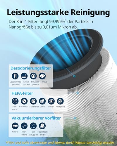 【 ELIMINIERT 99,999% DER IN DER LUFT BEFINDLICHEN ALLERGENPARTIKEL 】 Die Kombination aus einem Vorfilter, einem Desodorierungsfilter und einem HEPA-Filter entfernt 99,999 % der Partikel in Nanogröße bis zu 0,01 Mikron, einschließlich Pollen, Staub, Rauch und anderer Allergene. Der Filter reduziert außerdem 99 % der flüchtigen organischen Verbindungen und Gerüche.