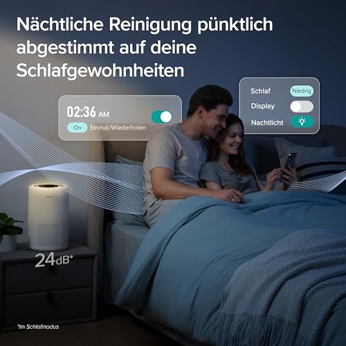 Besonders leiser Betrieb: Mit QuietKEAP-Technologie arbeitet der Luftreiniger im Schlafmodus nahezu geräuschlos (24dB); Lautstärke bei höchster Stufe ist 45dB