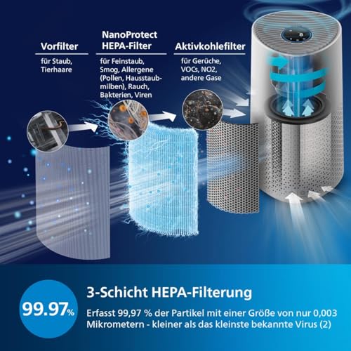3-SCHICHT-HEPA-FILTERUNG: Erfasst 99.97% % der Partikel bis zu 0.003 Mikrometer (2) – zum Schutz vor Pollen, Staub, Hausstaubmilben, Tierhaaren, Smog oder Gasen. Der Philips NanoProtect HEPA-Filter kann bis zu zweimal mehr Luft reinigen als herkömmliche (traditionell) HEPA H13-Filter (3).