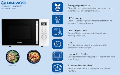 MD-FC206SW Solo-Mikrowelle, 20 L, 700 W Leistung, 8 Automatikprogramme, 5 Leistungsstufen, Timer, Weiß