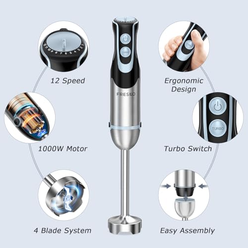 FRESKO 4-in-1 Stabmixer Edelstahl, 1000W Pürierstab mit 12 Geschwindigkeiten und Turbo-Modi, Inklusive Schneebesen, 500ml Lebensmittelhacker und 700ml Messbecher, für Babynahrung, Suppe, Smoothies