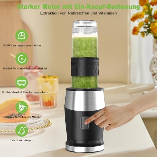 Mixer, 500W Smoothie Maker & Standmixer & Mixer Smoothie Maker mit 570ml Smoothie Flaschen BPA frei Tritan,Tragbarer Blender Smoothie Maker aus Edelstahl 4-Blatt für Shake, Smoothie und Babynahrung