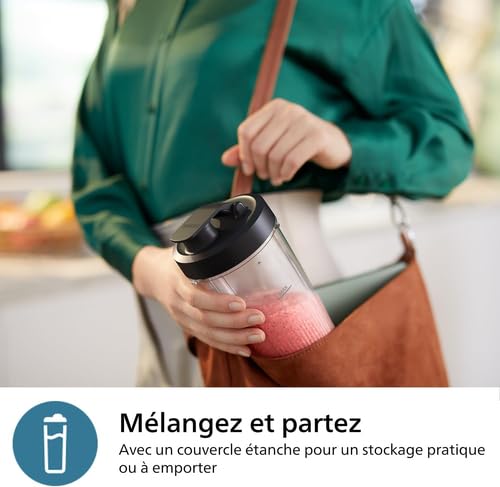 Mixen und los: Verwenden Sie den großen Becher, um mühelos Ihren täglichen Smoothie zuzubereiten. Der auslaufsichere Deckel sorgt dafür, dass Sie Ihren nährstoffreichen Mix bequem mitnehmen können. Sie können ihn auch im Kühlschrank aufbewahren, um ihn später am Tag als erfrischenden Snack zu genießen.