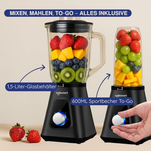 ![Safecourt Standmixer – Kraftvoller Smoothie Maker, Blender & Mixer [1200W & 1,5L Glasbehälter] – für Smoothies, Shakes, Suppen, Dips und mehr [inkl. 600ML BPA-freier To-Go Becher] – Bild 3](https://m.media-amazon.com/images/I/51n3fhQJNWL.jpg)
