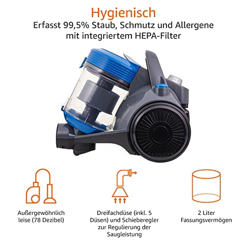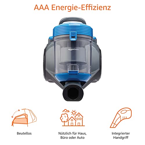 Amazon Basics Zylinder-Staubsauger, leistungsstark, kompakt und leicht, ohne Beutel, für Hart- und Teppichböden, HEPA-Filter, 700 W, 2.0 L, EU, Schwarz/Blau