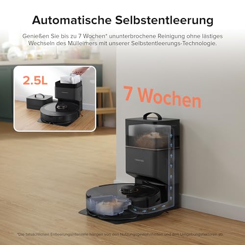 Selbstentleerend – Entleert Staub und Schmutz automatisch in den 2,5-Liter-Staubbeutel mit E12-Rating, der bis zu 7 Wochen lang nicht gewechselt werden muss.