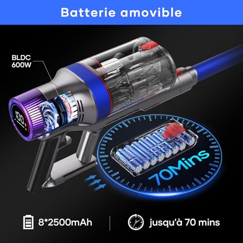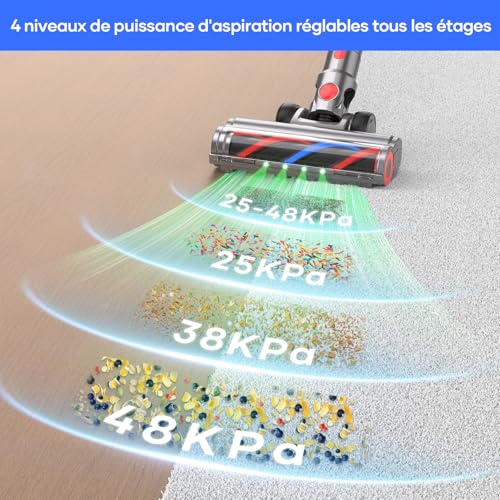 OLED -Touchscreen: OLED -Bildschirm auf dem akku-staubsauger zeigt Batterie- und Wartungswarnungen an, sodass Sie über den Vakuumlaufstatus auf dem Laufenden bleiben können. 4 Saugmodi mit 4 LED-Power-Leuchten: Auto-Modus mit Sensorlicht (25-48 kPa ≈ 20-70 min), ECO-Modus mit blauem Licht (25 kPa ≈ 70 min), Standardmodus mit lila Licht (38 kPa ≈ 40 min), Max-Modus mit Red Light (48 kPa ≈ 20 min).