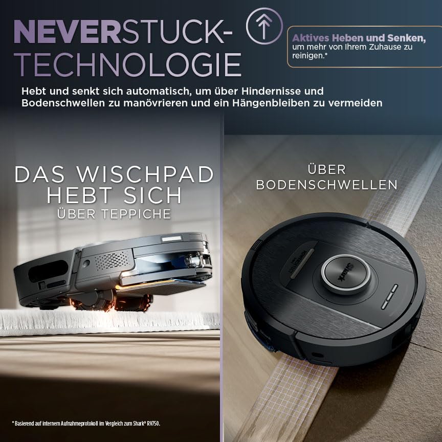 NEVERSTUCK-TECHNOLOGIE: Der Saugroboter hebt und senkt sich automatisch, um über Hindernisse und Bodenschwellen zu manövrieren und ein Hängenbleiben zu vermeiden