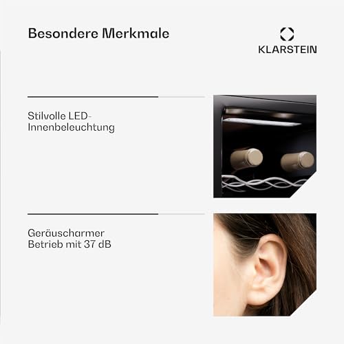 WEINKÜHLSCHRANK MIT 1 ZONEN: In diesem Flaschenkühlschrank kannst du bis zu 12 Flaschen deiner besten Weinflaschen lagern. Die Klarstein Weinkühlschränke sorgen für die richtige Temperatur, damit sich der Geschmack und das Aroma entfalten können.