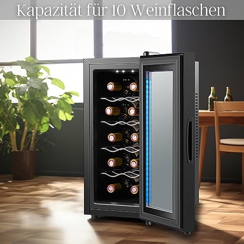 Weinkühlschrank 10 Flaschen 28 Liter LED Beleuchtung Weinkühler Weinklimakühlschrank Mini Kühlschrank Wein Kühler Minibar mit Glastür