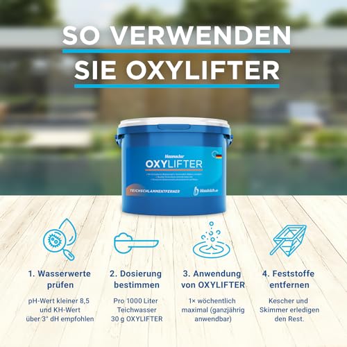 30–50 g OXYLIFTER pro 1.000 L Teichwasser einmal pro Woche anwendbar, für alle Teiche und Teichgrößen geeignet.