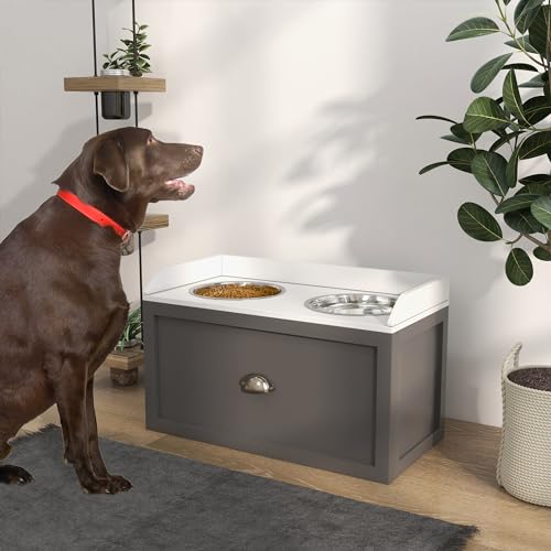 PawHut Hundenapf, 2 x 2L Futternapf, erhöhter Fressnapf mit Schublade, Edelstahlnapf, Futterstation für große Hunde, Grau