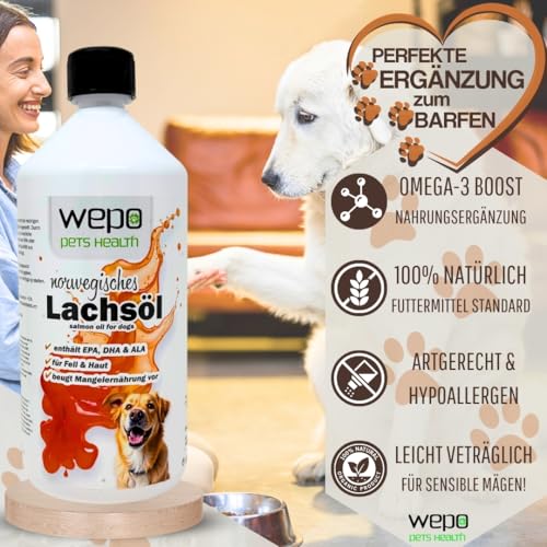 🐟 NATÜRLICHER OMEGA FISCHÖL-BOOST – Fischöl flüssig ist die perfekte Ergänzung für alle Felltiere! – Das Lachsöl von WEPO überzeugt durch seinen hohen Gehalt an wertvollen Omega-3- und Omega-6-Fettsäuren und enthält auf natürliche Weise Astaxanthin sowie Vitamin E. Tierhalter von Hunden und Katzen schätzen es besonders wegen seiner vielfältigen positiven Effekte.