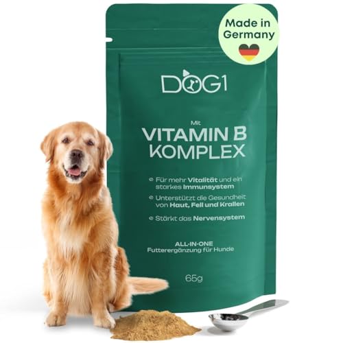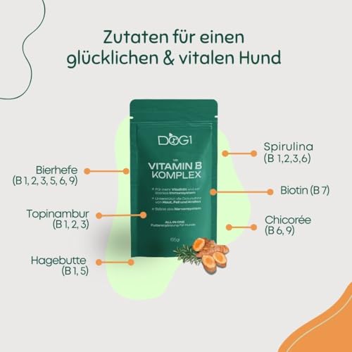 Erlebe die Vitalität deines Hundes: DOG1 Hunde Vitamine – Vitamin-B-Komplex Hund vereint einen kraftvollen Vitamin-B-Komplex (B1, B2, B3, B5, B6, B7, B9, B12) mit hochdosiertem Glucosamin & Chondroitin, Bierhefe sowie prä- & probiotischen Inhaltsstoffen – für gesunde Gelenke, starke Verdauung und ein glänzendes Fell!