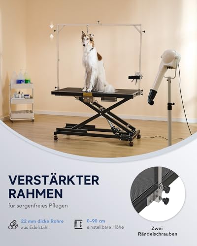 Verstellbare Höhe — Die Höhe der Pflegeleiste dieses elektrischen Haustierpflegetischs kann auf bis zu 90 cm eingestellt werden und verfügt über 4 Seile in 2 verschiedenen Ausführungen, die für Pudel, Golden Retriever und alle dazwischen liegenden Haustierrassen geeignet sind, einschließlich Katzen.